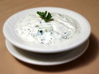 | Sastojci: 2 šoljice običnog jogurta, 5 malih krastavaca, 1 kašičica suve mente, so i biber Priprema: Operite i ogulite krastavce. Pomiješajte nasjeckane krastavce i jogurt. Dok miješate, ubacite metvicu. Posolite, pobiberite. Ako želite uživati u iranskoj hladnoj supi, u ovu smjesu dodajte 1/2 šoljice vode i grožđice. |