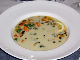 | Sastojci: 200 g slanine, narezane na manje komade, 2 luka, nasjeckana, 3 stabljike celera, nasjeckati, 10 češnja bijelog luka, samljeti, 2 paprike, nasjeckat, 1/4 šoljice brašna, 1 l bistre pileće supe, bistre riblje supe ili supe od školjki, 3 lovorova lista, 600 g krompira, polovinu skuvati i napraviti pire, drugu polovinu ne kuvajte, ali narežite na sitne komade. 1 šoljica vrhnja, 1,5 l očišćenih školjki, u soku koji iscuri tokom čišćenja, so i biber, ljuti umak, 1 šoljica nasjeckanog mladog luka, 2 kašičice maslaca (ako želite). Priprema: Na najjačoj vatri 1 minut ugrijte lonac. Dodajte slaninu i pecite oko 5 minuta ili dok slanina ne postane prozirna i bezbojna, povremeno miješajte. Dodajte luk, celer, bijeli luk, papriku i kuvajte još 15 minuta. Povremeno miješajte. Dodajte brašno, neprestano miješajte tako da se ništa ne uhvati za dno lonca. Kuvajte oko 2 minuta. Dodajte supu i lovorovo lišće pa lagano kuvajte na srednjoj vatri oko 25 minuta (nepoklopljeno). Dodajte pire, promiješajte i pustite da kuva još 3 minute. Dodajte narezani krompir, kuvajte 25 minuta ili dok krompir ne omekša. Dodajte mlijeko, pustite da prokuva i kuvajte još 2 minuta. Dodajte školjke i kuvajte dok se rubovi ne uvrnu, pobiberite i posolite. Stavite u tanjire, dodajte malo ljutog umaka i posipajte tanko nasjeckanim mladim lukom. Možete dodati i malo maslaca, neka pluta u tanjiru. |
